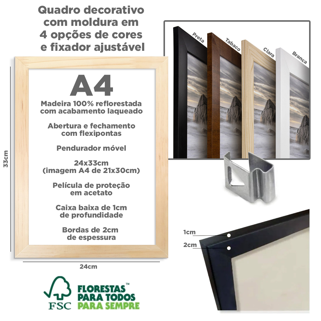 • Moldura: madeira pinus com acabamento laqueado de 2cm de largura sem vidro, acompanha película de proteção em acetato e pendurador móvel