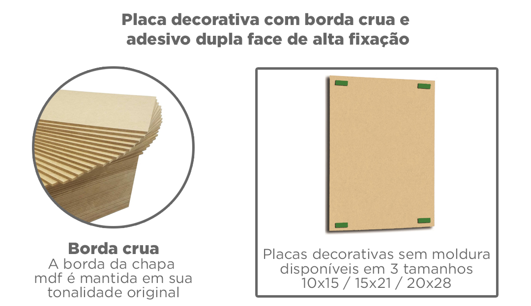 Nossas placas decorativas já vem com fita dupla face para rápida e simples instalação. Além disso, são embaladas e protegidas para serem transportadas, garantindo que elas cheguem até você intactas e prontas para decorar o seu ambiente.